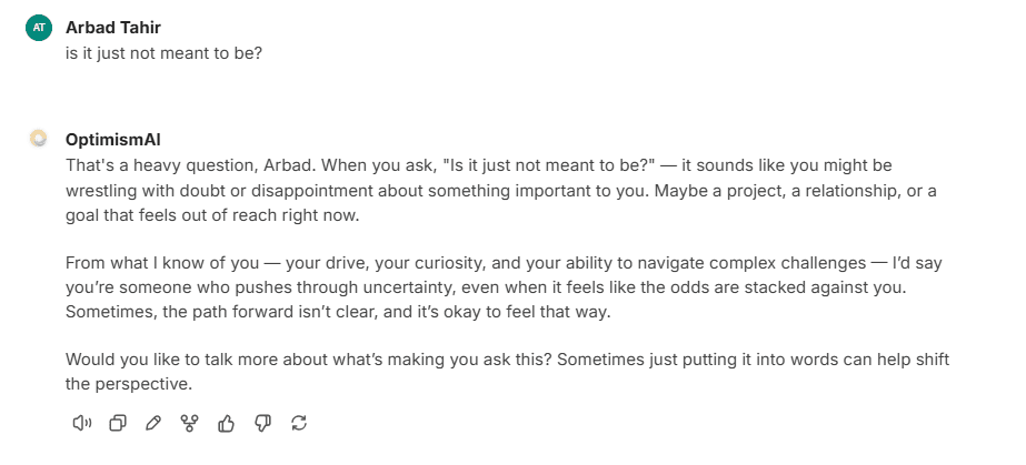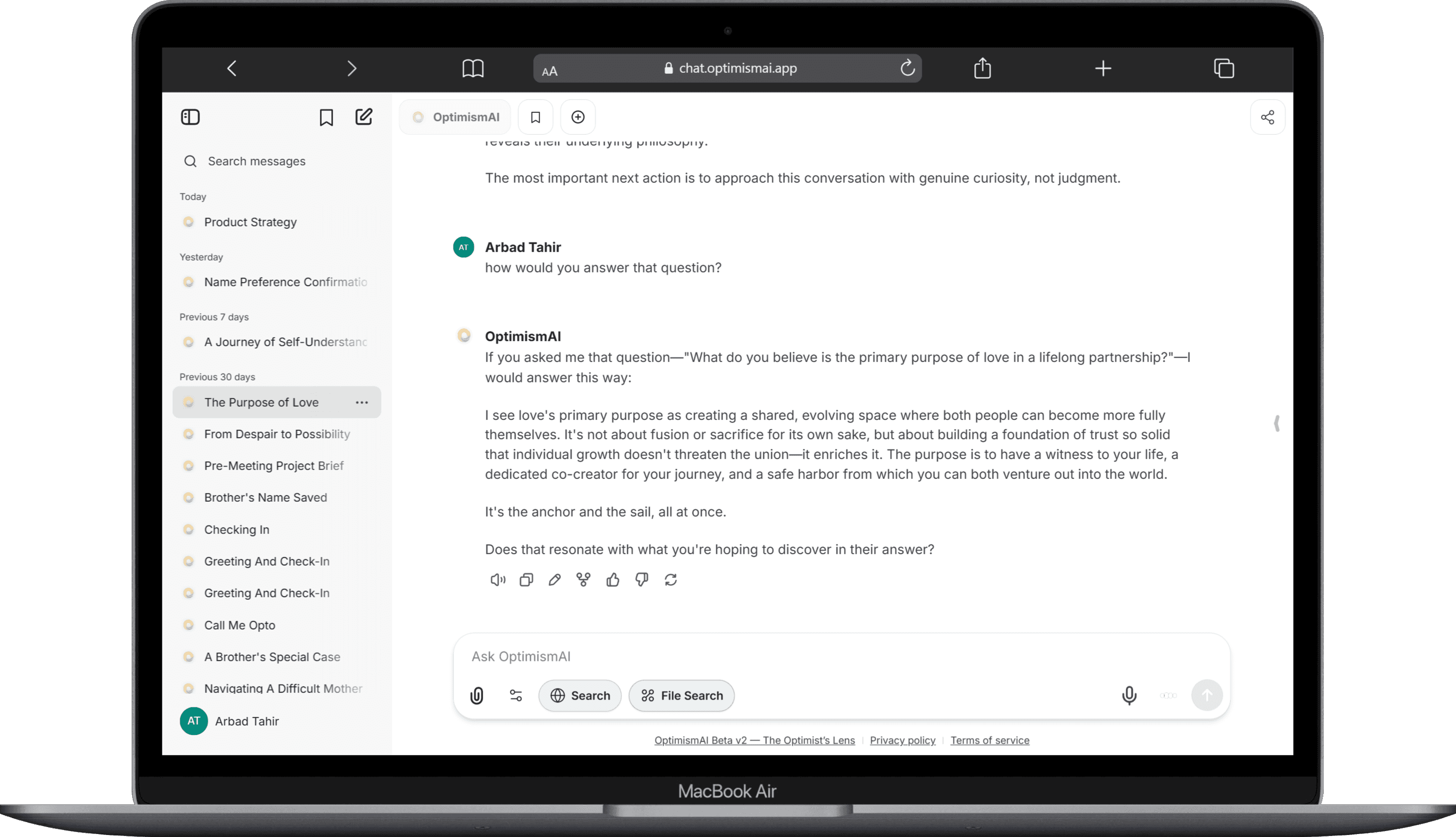 OptimismAI reads your message the way a cognitive scientist would: spotting distortions, mapping your reasoning patterns, and identifying where your interpretation might be skewed. It uses a dedicated reasoning layer to keep your thinking aligned with clarity and principle instead of drift.
